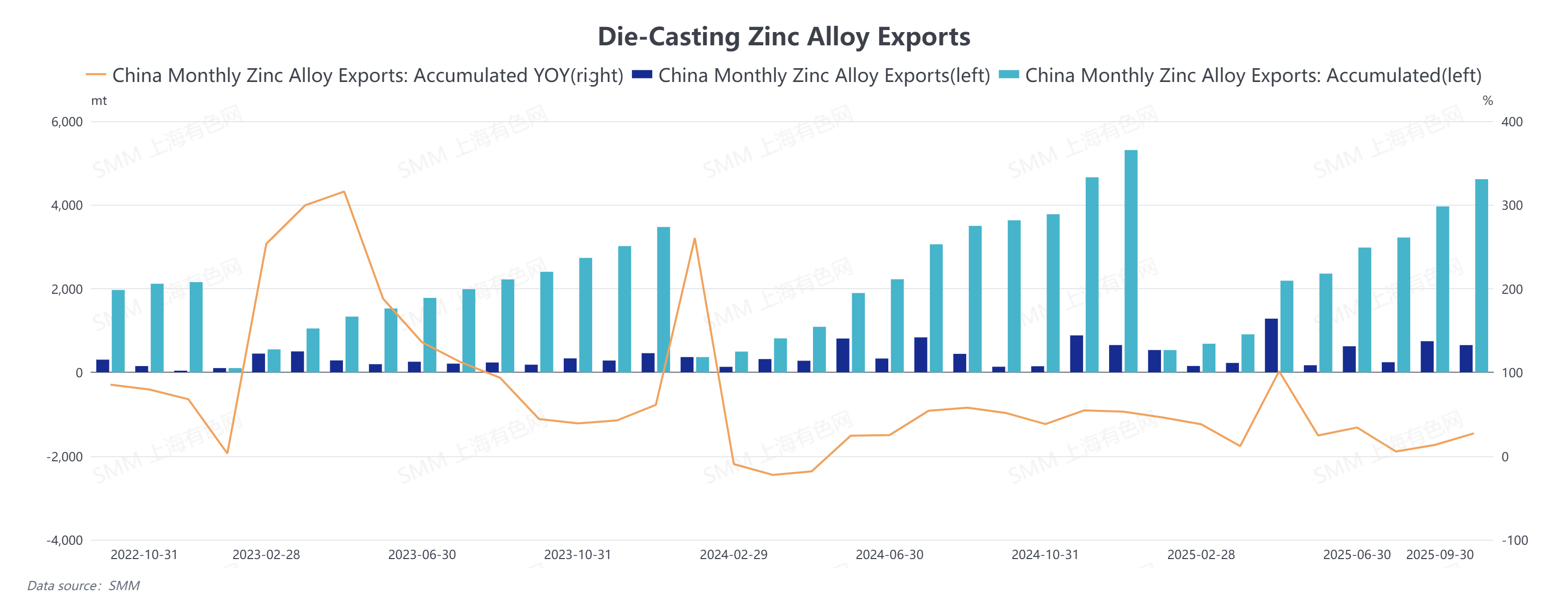 According to the latest customs data, China's imports of unwrought zinc alloy in September stood at 3,792.09 mt, down 6.31% YoY, while exports reached 650.15 mt, surging 387.26% YoY.