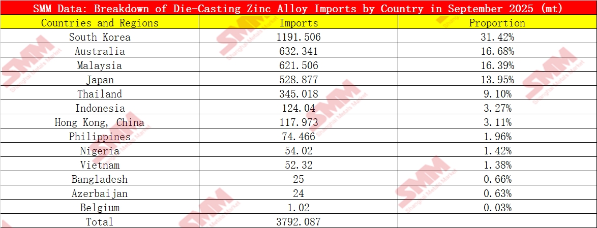 By trade flow, the top three source countries for China's unwrought zinc alloy imports in September were South Korea (1,191.506 mt, 31.42%), Australia (632.341 mt, 16.68%), and Malaysia (621.506 mt, 16.39%). MoM, Australia and Malaysia re-entered the top three, while Thailand and Japan—ranked second and third in August—imported only 0 mt and 0.002 mt, respectively, in September.