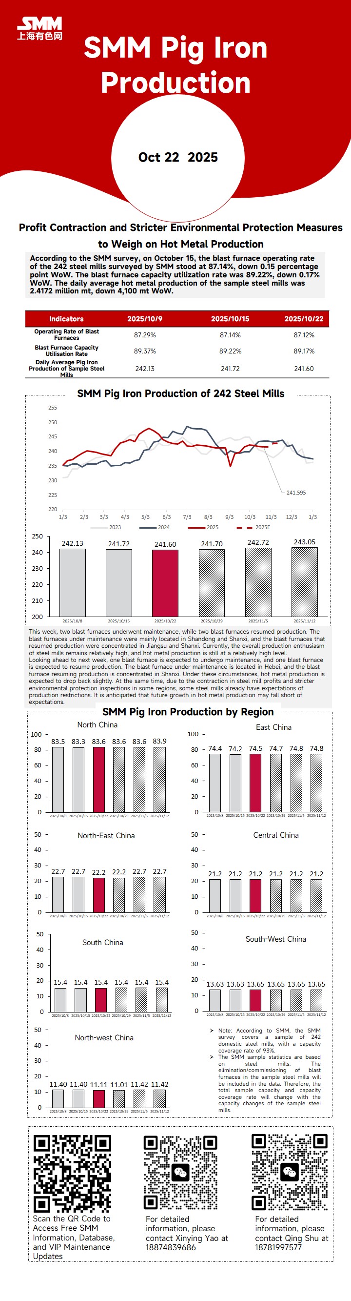 According to the SMM survey, on October 15, the blast furnace operating rate of the 242 steel mills surveyed by SMM stood at 87.14%, down 0.15 percentage point WoW.