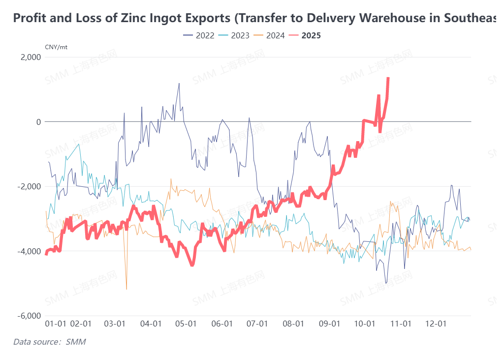 Furthermore, while LME zinc prices have been rising, the domestic Chinese zinc market has been weighed down by supply surplus and weak demand, leading to divergent performances between domestic and overseas markets, with LME outperforming SHFE. Since October, import losses for Chinese zinc ingots have continued to widen, while the export window has occasionally opened. As of October 21, the profit for exporting zinc ingots to LME warehouses reached 1,376 yuan/mt, and the spot profit for exporting to Southeast Asia was 2,016 yuan/mt. Driven by profits, some domestic suppliers have begun exporting and delivering to warehouses. The outflow of these hedged export volumes might supplement LME zinc inventories, casting doubt on the likelihood of an actual LME zinc squeeze, warranting close monitoring of future zinc ingot exports.