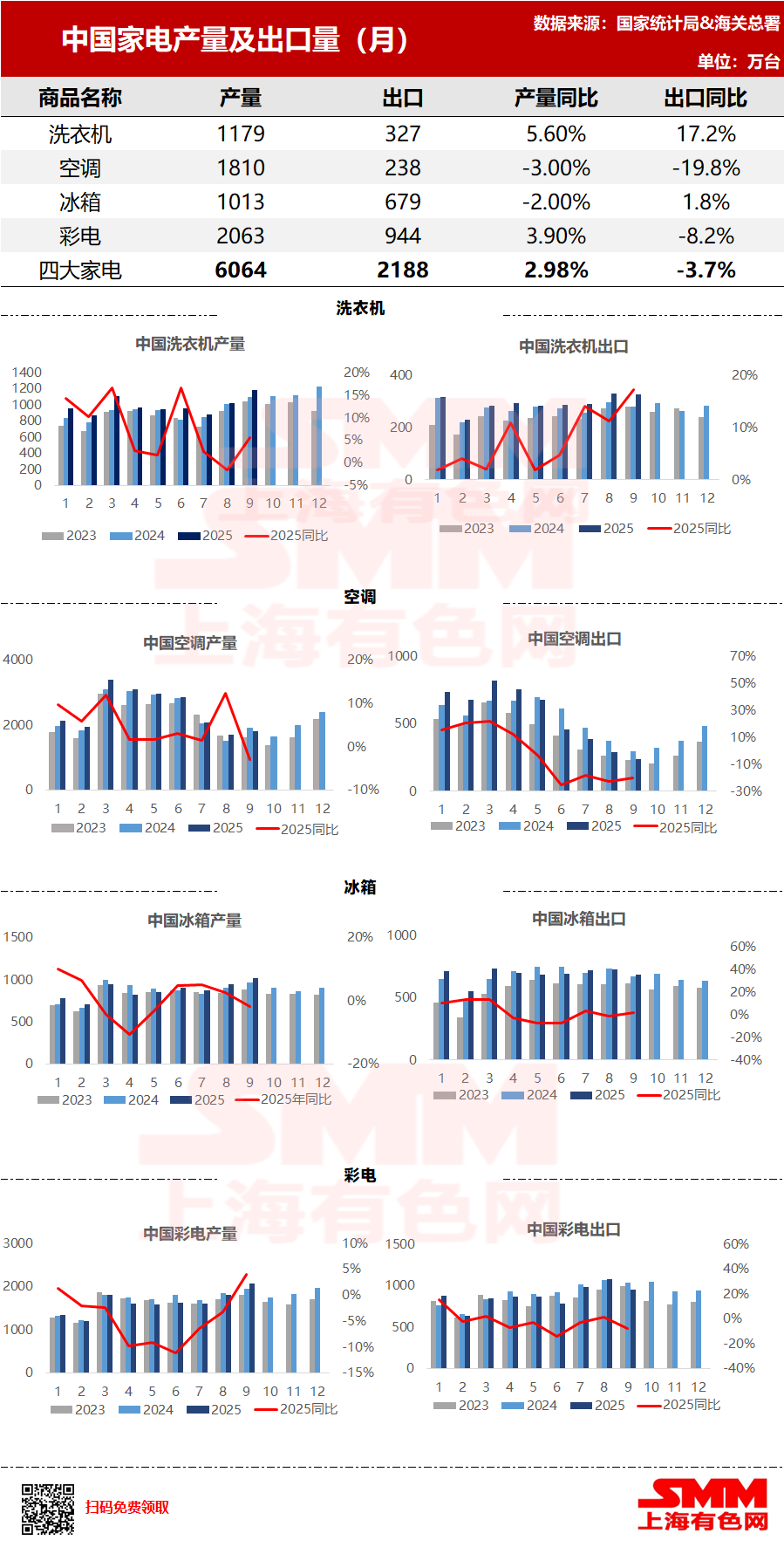 Refrigerator exports in September were 6.79 million units, up 1.8% YoY; cumulative exports from January to September were 61.65 million units, up 1.6% YoY.