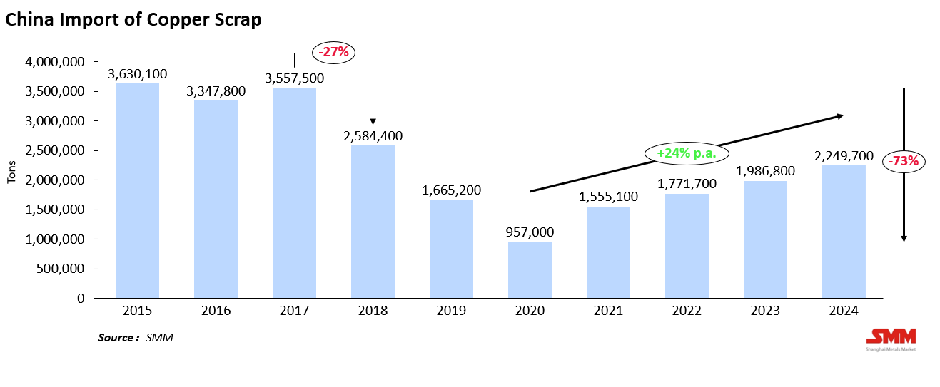 The impact was immediate: low-quality copper scrap was effectively blocked, and large volumes of U.S. and European copper scrap were diverted elsewhere. Data clearly reflects this policy effect — China’s copper scrap imports fell from 3.55 million tons in 2017 to 2.58 million tons in 2018, a 27% drop, and further declined to 0.95 million tons by 2020, down 73% from the 2017 peak. Although imports gradually recovered to 2.25 million tons in 2024, they remain far below historical highs. China’s high-standard policy framework in 2018 directly triggered the first wave of global copper scrap trade restructuring.