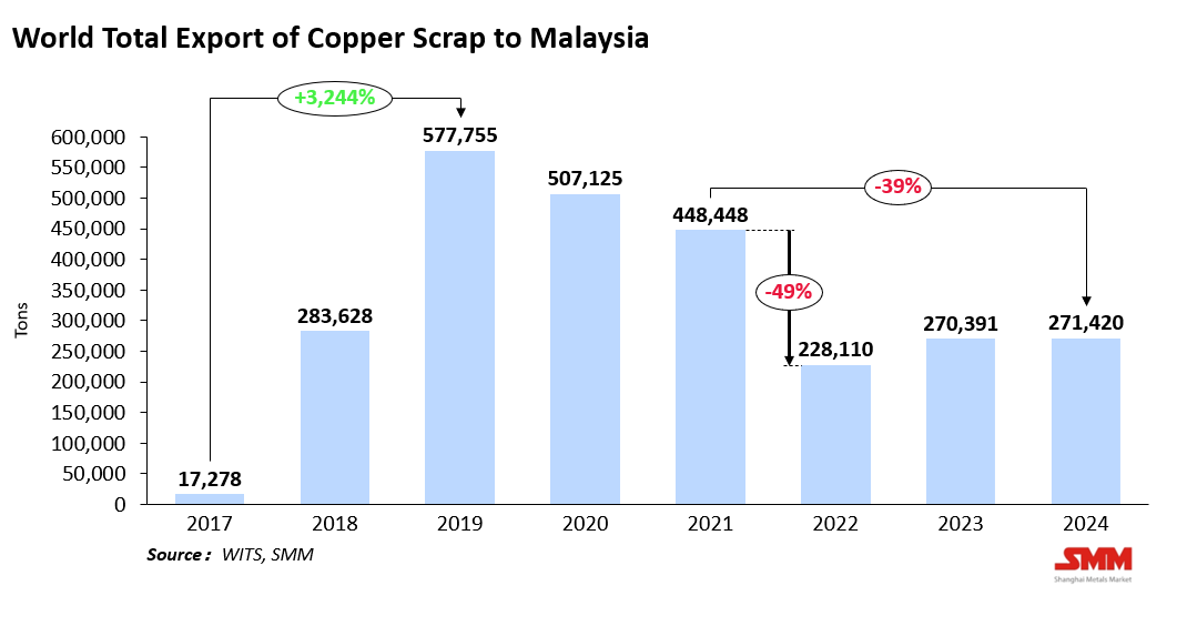 For example, Malaysia’s copper scrap imports surged from 17,000 tons in 2017 to a peak of 570,000 tons in 2019, before declining to 448,000 tons in 2021. This rapid expansion, however, led to environmental pollution, smuggling, and non-compliant processing, prompting these countries to strengthen regulations: