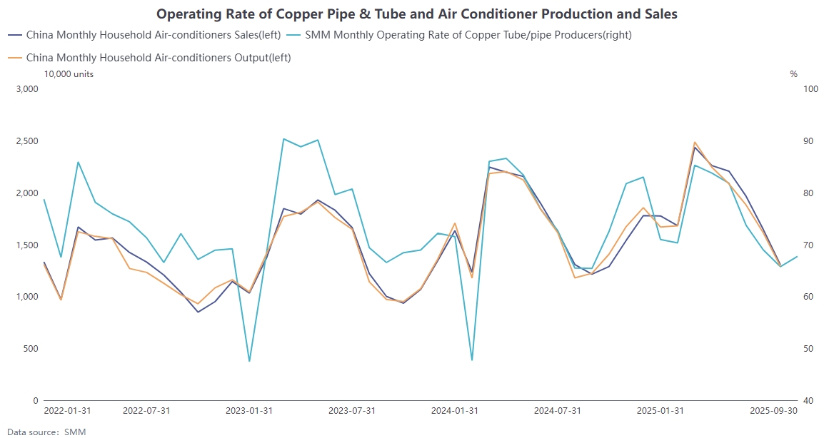 Due to consecutive declines in production schedules of air conditioner manufacturers, the operating rate of copper pipe & tube is expected to remain weak from September to November. According to SMM's market communication, pipe factories described September and October as the worst "peak season" in recent years. Additionally, copper prices surged to over 85,000 yuan/mt, leading enterprises to slow procurement, reduce raw material inventory, and cut demand for imported raw materials.