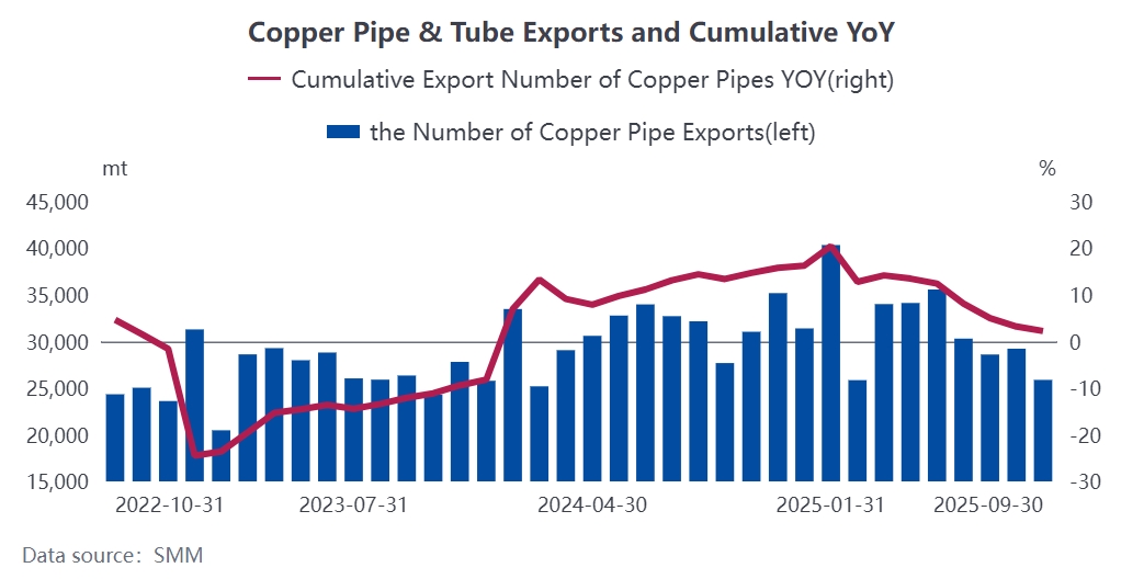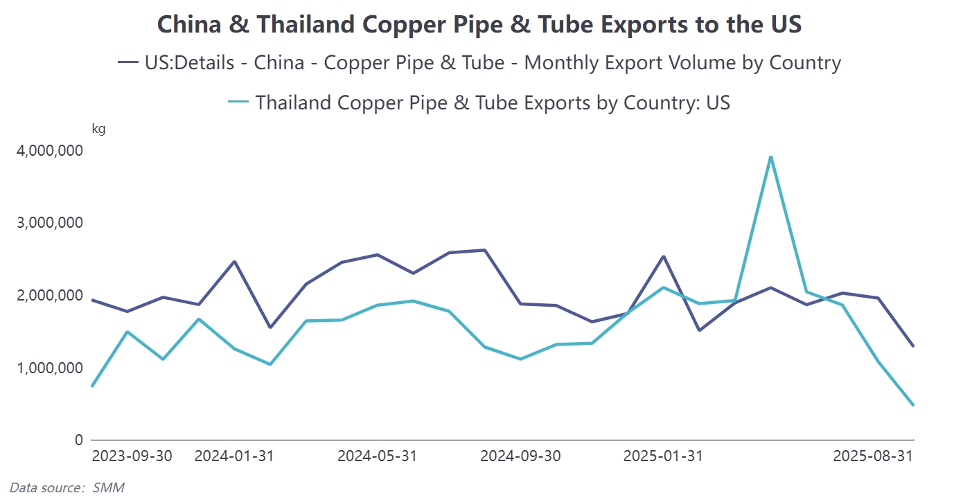 Thailand and the US remain the largest destinations for China's copper pipe & tube exports. However, US tariffs on copper pipe & tube have significantly reduced direct exports to the US, and Thailand's exports to the US have also declined. In October and November, export orders typically rise ahead of the overseas Christmas season, but performance in October this year is expected to be weak, with both YoY and MoM figures projected to pull back.