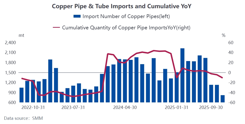 China's copper pipe & tube imports in September totaled 817.4 mt, hitting the lowest level this year, down 27.46% MoM and 57.64% YoY, with a cumulative decline of 10.96% YoY. Exports of copper pipe & tube in September were 25,892.1 mt, down 11.44% MoM and 6.52% YoY, while cumulative exports increased 2.26% YoY.The import and export performance in September aligns with the August forecast, showing declines in both copper pipe & tube imports and exports.