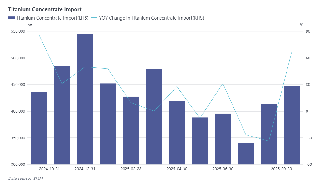 In September, China's imports of titanium ore reached 447,400 tons, an increase of 8.16% compared to the previous month. The cumulative import volume for 2025 has reached 3.76 million tons, with a cumulative year-on-year growth of 4.92%. Overall, the demand for imported ore has been strong this year, primarily due to two factors: First, the price advantage of imported ore has gradually become apparent. For instance, the average import price from Mozambique was $274 per ton, offering better quality and more competitive pricing than domestic alternatives, thereby sustaining robust market demand. Second, the titanium dioxide industry has significantly expanded production, coupled with strong order placements in September, jointly driving the demand for raw materials.
