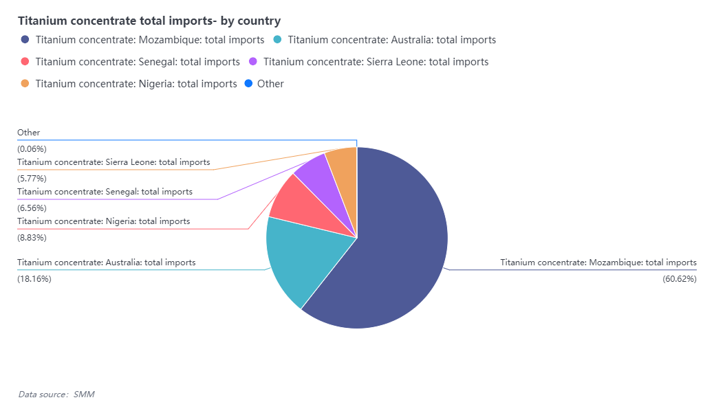 In terms of import sources, Mozambique ranked first with 280,500 tons, indicating that Africa remains the primary region for China's titanium ore imports.