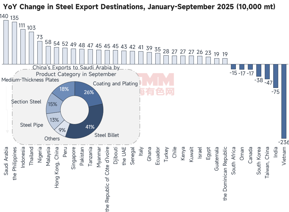 According to data compiled by SMM from the General Administration of Customs, China's cumulative steel export volume from January to September 2025 reached 98.6964 million mt, up 17.14% YoY. Saudi Arabia remained the country with the largest cumulative YoY increase, up 1.4001 million mt, or 41.28% YoY. Specifically, among all steel product categories exported to Saudi Arabia in September, HRC's share expanded again to 45%, accounting for nearly half of the total, followed by steel billet at 19%, while coated/galvanized and medium-thickness plates accounted for 12% and 8%, respectively. Compared with the export product distribution in August, some changes occurred: the shares of medium-thickness plates and coated/galvanized products declined, while the proportions of steel billet and HRC increased again.