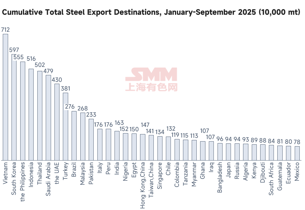 In terms of cumulative total export volume, Vietnam remained the top destination for China's steel exports, with cumulative exports reaching 7.1204 million mt by September this year. However, it also showed the largest YoY decline, down 24.91%. The primary reason for this change is Vietnam's increasingly stringent anti-dumping measures against Chinese steel products, with five case rulings issued so far this year. Recently, the Vietnamese Ministry of Industry and Trade (MOIT) initiated an anti-circumvention investigation on certain HRC products originating from China. According to the relevant government document (Decision No. 3176/QD-BCT, signed by Vietnamese Vice Minister of Industry and Trade Nguyen Sinh Nhat Tan on October 27), the products under investigation are HRC with widths >1,880 mm and ≤2,300 mm. The specific specifications of the products involved are flat-rolled iron or steel (alloy or non-alloy), hot-rolled, with thicknesses between 1.2 mm and 25.4 mm. However, the following products are excluded from the scope of this investigation: HRC with a carbon content >0.3% by weight; thick plates with thickness ≥10 mm; and HRC products already covered by existing anti-dumping duties. According to the SMM survey, with the ruling outcome still uncertain, some export traders are intensifying efforts to dispatch vessels to Vietnam to mitigate risks, and current wide coil order intake performance is favorable.