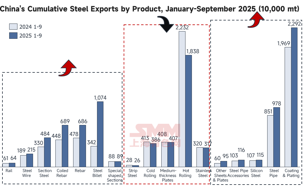 Ø By product category, steel billet recorded the largest increase, while hot-rolled products saw the largest decline.