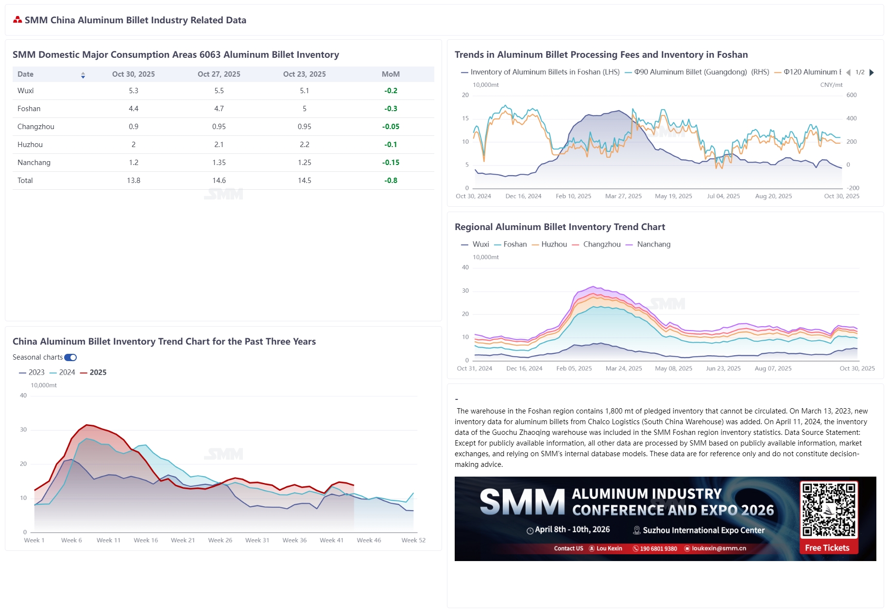 Regarding aluminum billet inventory, according to SMM statistics, the inventory of aluminum billets in major domestic consumption areas was 138,000 mt on October 30, down 8,000 mt from Monday and 7,000 mt from last Thursday. The inventory decline was mainly due to active production cuts by some billet plants since October, resulting in limited growth in warehouse arrivals, coupled with the gradual digestion of previously accumulated plant inventories after concentrated shipments. On the demand side, although end-use demand was suppressed by high aluminum prices, downstream maintained just-in-time procurement, supporting stable warehouse withdrawals. Although market shipments saw a slight rebound, transactions were mostly concentrated among traders, while actual downstream purchasing remained weak, with a predominant wait-and-see attitude due to high prices, indicating that demand-side performance remains pessimistic. Looking ahead to next week, if aluminum prices continue to hover at highs, downstream purchase willingness may be further suppressed. However, considering outbound truck shipments, aluminum billet inventory is expected to continue a slow decline, maintaining a sideways movement in the short term within the range of 130,000–145,000 mt. A rapid destocking scenario still requires a pullback in the price center to stimulate a rebound in end-use demand.
