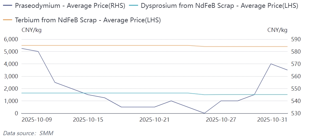In terms of prices, oxide prices continued to decline in October. To control costs, recycling enterprises repeatedly lowered scrap quotations, leading to a significant drop in scrap prices. At the beginning of the price decline, driven by panic, suppliers concentrated on selling off scrap, which temporarily improved procurement conditions for recycling enterprises. However, as prices continued to fall, suppliers' willingness to sell decreased sharply, making procurement significantly more difficult for recycling enterprises. Most enterprises had to rely on depleting their inventory to maintain production. Although raw material inventories of recycling enterprises were relatively sufficient, ensuring normal production, procurement difficulties remained prominent. Starting in October, intensified scrutiny of reverse invoicing and the full implementation of the rare earth product traceability system led recycling enterprises, for compliance reasons, to prefer purchasing invoiced scrap, further exacerbating procurement challenges.