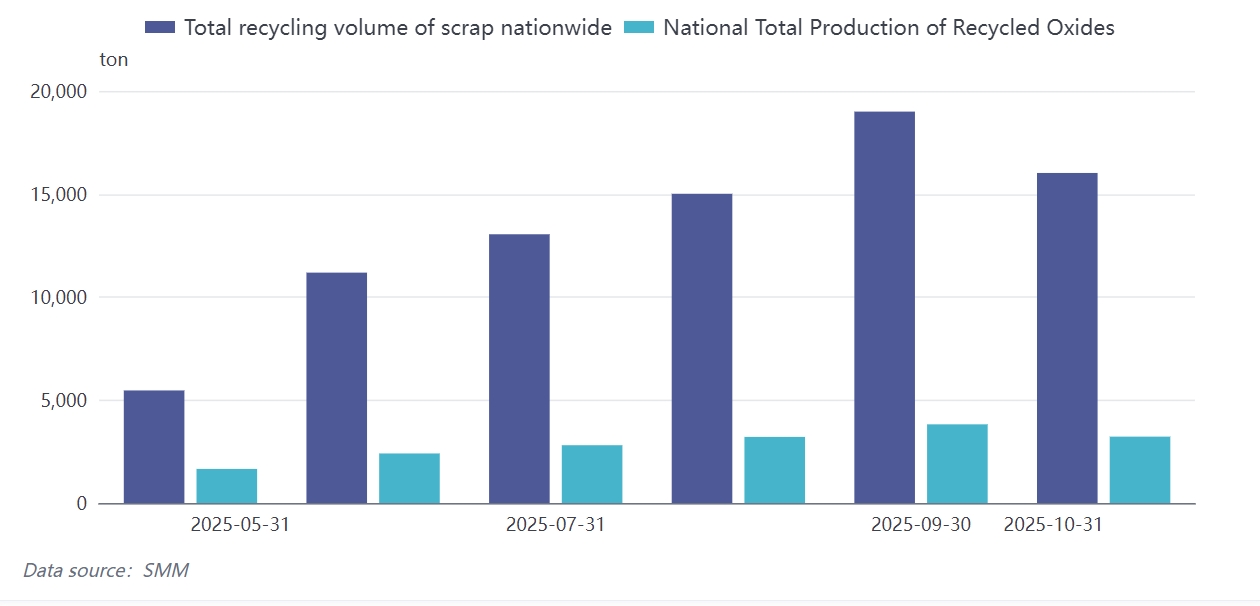Looking ahead to November, the market landscape is expected to see positive changes. In the initial phase of the one-year extension of export controls, downstream magnetic material enterprises are anticipated to experience a significant increase in orders. As orders rise, national NdFeB production is projected to grow, with a corresponding increase in scrap output. At the same time, the growth in downstream orders will drive up demand in the oxide market, pushing oxide prices higher and improving the profitability of scrap enterprises. With both supply and demand showing strong momentum, the output of recycled oxides is expected to increase.