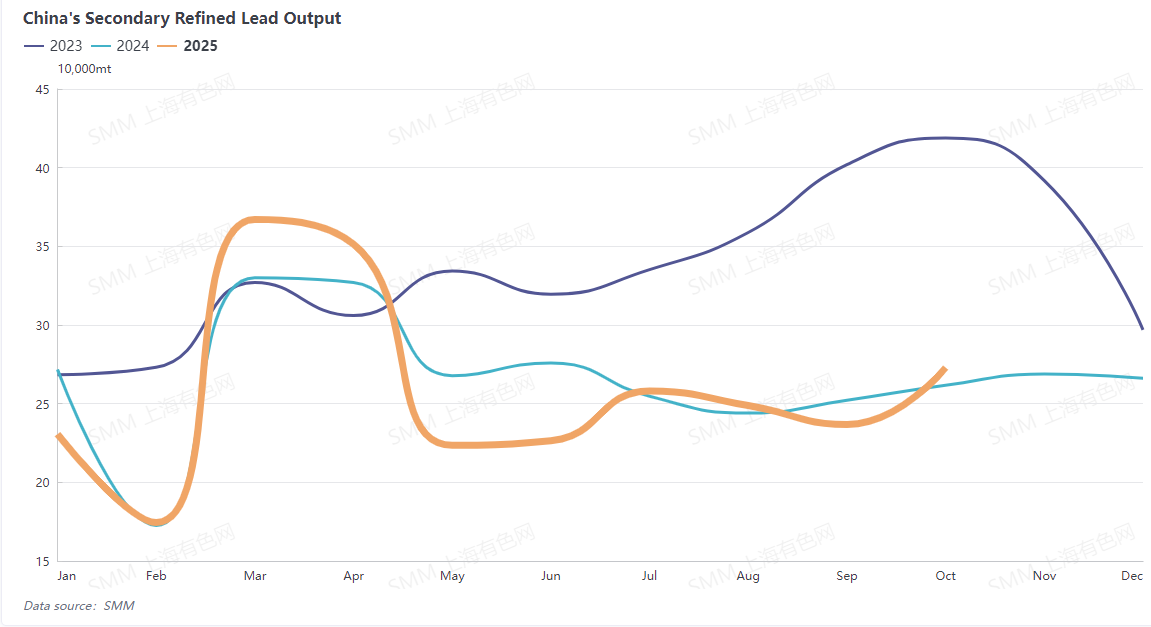 China's secondary lead production in October 2025 increased significantly, up 9.24% MoM and 11.86% YoY; secondary refined lead production rose 15.25% MoM and increased 4.27% YoY.