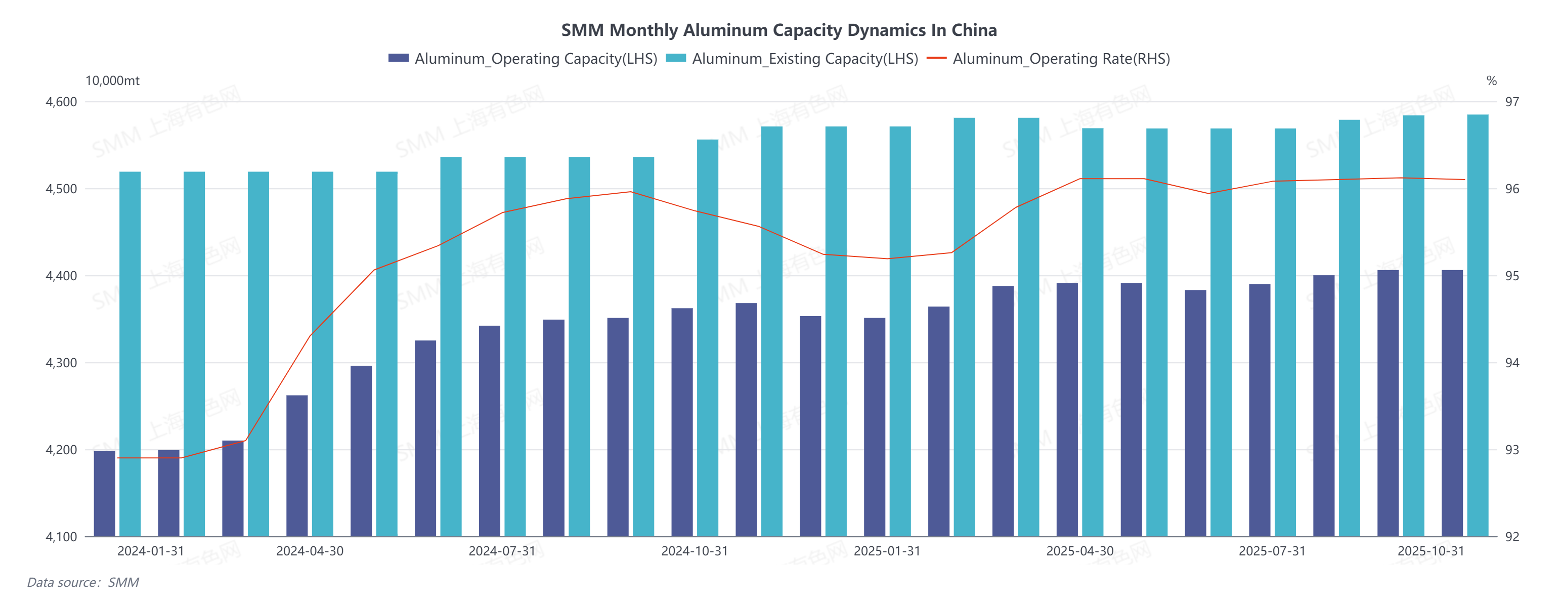 Capacity changes: By the end of October, SMM statistics showed that China's existing aluminum capacity was approximately 45.84 million mt (SMM made revisions after considering capacity replacement and old plant demolitions, excluding some double-counted capacity). Domestic operating aluminum capacity was about 44.06 million mt, flat from the previous month.