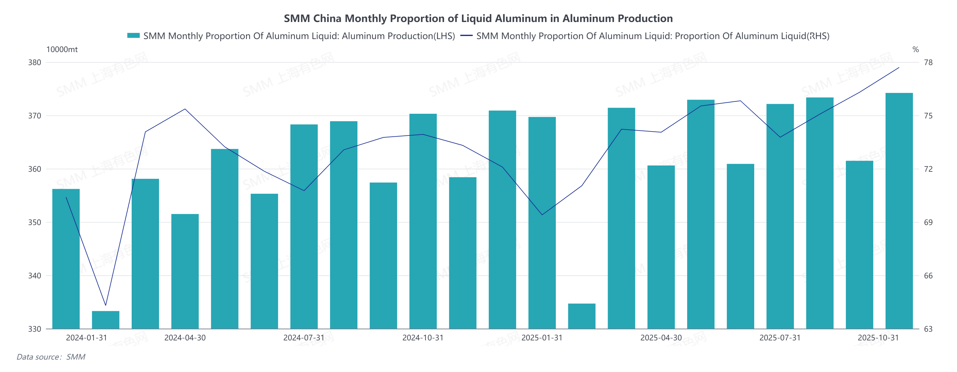 According to SMM statistics, China's aluminum production in October 2025 (31 days) increased 1.13% YoY and 3.52% MoM. The traditional peak season continued in October. Although the October peak season was slightly weaker than expected, the proportion of liquid aluminum at domestic aluminum smelters rebounded more than expected as downstream processing plants near the smelters resumed and increased production. The industry's proportion of liquid aluminum rose 1.4 percentage points MoM to 77.7% this month. Based on SMM's liquid aluminum proportion data, China's aluminum casting ingot production in September decreased 13.5% YoY and fell 2.6% MoM to around 834,000 mt.