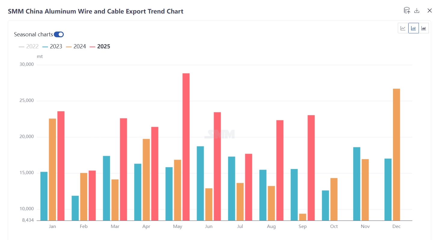 Customs data shows that China's aluminum wire and cable exports reached 23,000 mt in September 2025, up 3.1% MoM and 145% YoY. Cumulative exports for January-September totaled 198,000 mt, up 30.6% YoY from 151,600 mt in the same period of 2024. By product, exports of steel-core aluminum stranded wire reached 15,500 mt, up 4% MoM and 233% YoY, accounting for 67% of total exports; exports of aluminum stranded wire stood at 7,500 mt, up 2% MoM and 59% YoY, accounting for 33% of the total. (HS codes: 76141000, 76149000)