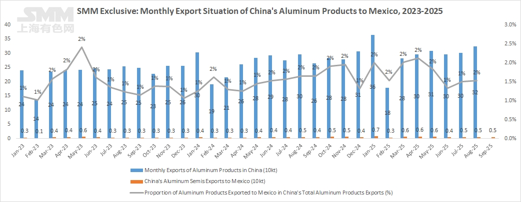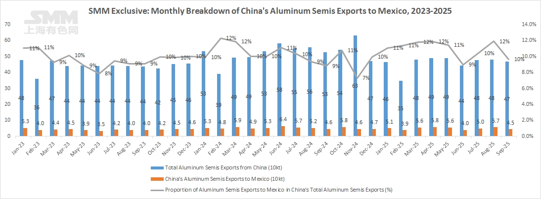 Peak Periods: During multiple periods such as February–April 2024 and March–May 2025, the proportion climbed to 11%–12%, reflecting the demand resilience of the Mexican market for Chinese aluminum semis during specific cycles.