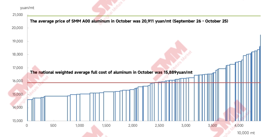 According to SMM data, the average tax-inclusive full cost of China's aluminum industry in October 2025 was 15,889 yuan/mt, down 1.8% MoM and 13.3% YoY, mainly due to the decline in the average monthly spot alumina price during the period, leading to lower costs. SMM data showed that the monthly average of the SMM alumina index in October was 2,938 yuan/mt (September 26–October 25), down 175 yuan/mt MoM, and the weighted average alumina cost for the national aluminum industry fell 5.5% MoM. The average SMM A00 spot price was approximately 20,911 yuan/mt (September 26–October 25), with the average profit in the domestic aluminum industry reaching about 5,022 yuan/mt.
