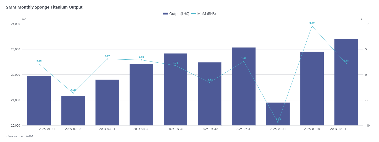According to SMM statistics, China's sponge titanium production in October 2025 was approximately 23,400 tons, up 2.18% month-on-month, with cumulative production increasing by 3.03% year-on-year. Overall supply remained stable.