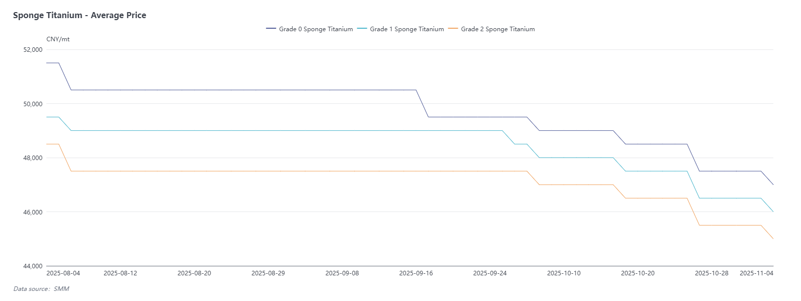 In October, the sponge titanium market showed an overall downward price trend. Specifically, the mainstream quotation for Grade 0 sponge titanium was 46,500-48,500 yuan/ton, with an FOB quotation range of $6,600-6,650/ton; the quotation for Grade 1 sponge titanium was 45,500-47,500 yuan/ton; the quotation for Grade 2 sponge titanium was 44,500-46,500 yuan/ton. The full-month price cumulatively decreased by approximately 1,500 yuan/ton, continuing the downward trend.