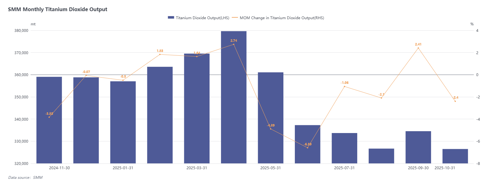 According to SMM data, domestic titanium dioxide production in October was 326,000 tons, down 2.40% month-on-month; cumulative production from January to October 2025 decreased by 8.28% year-on-year. During the same period, producer inventories fell by 5.33% month-on-month.