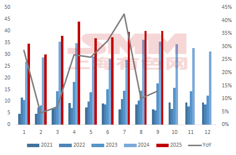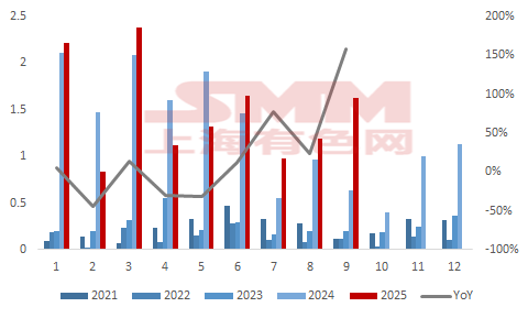 According to data from the General Administration of Customs, since 2021, the export volume of the involved products from China has shown a year-on-year growth trend. In 2024, the annual export volume of the involved products increased sharply, up 125.03% YoY, reaching 3.8007 million mt. From January to September this year, exports reached 3.3945 million mt, up 20.34% YoY (exports in the same period of 2024 were 2.8209 million mt), with a monthly average of 377,200 mt.