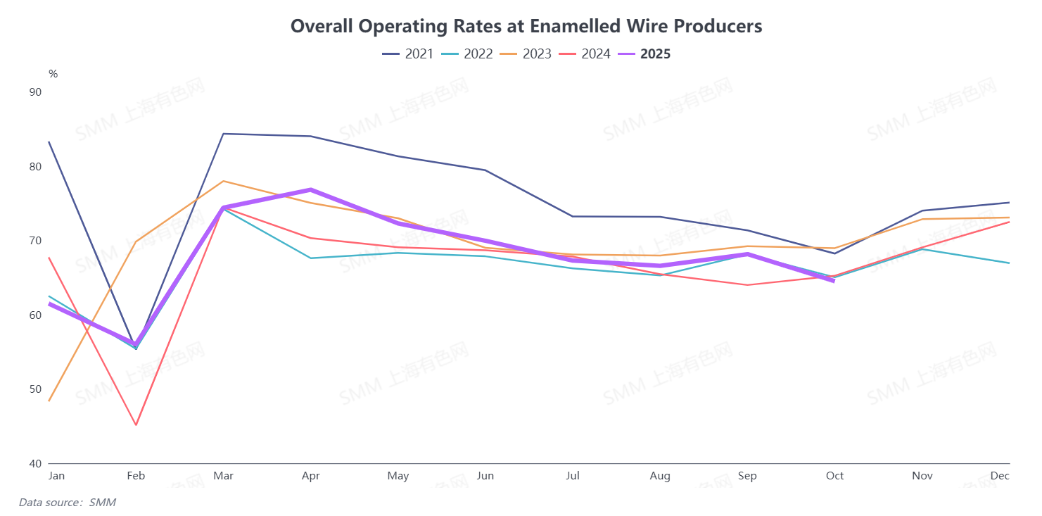 In October, the operating rate of the enamelled wire industry unexpectedly declined by 3.56 percentage points, falling short of the levels seen in the same period in previous years. Specifically, on one hand, weak end-use demand combined with the impact of the National Day and Mid-Autumn Festival holidays led to an increase in the number of holidays taken by enterprises and downstream customers compared to last year, with extended durations directly dragging down the monthly operating rate. On the other hand, after the holidays, copper prices rose more than expected, and end-user enterprises showed low acceptance of finished product price increases driven by rising raw material costs, resulting in delayed progress on previous orders, hindered release of new orders, and a lack of the typical peak season effect for the industry.
