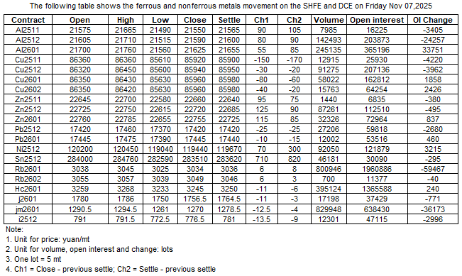 The following table shows the ferrous and nonferrous metals movement on the SHFE and DCE on 07 Nov , 2025