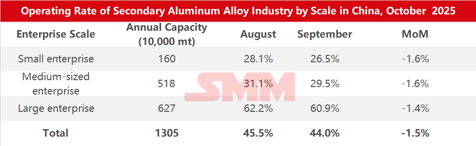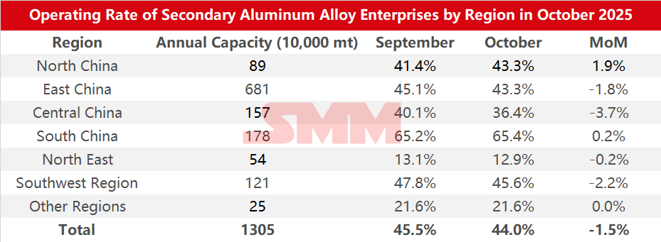 Survey Data on Operating Rates of Secondary Aluminum Alloy Enterprises by Region and Scale in October 2025: