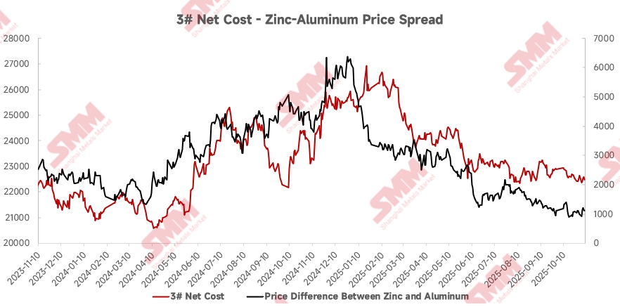Examining the zinc-aluminum price spread, since Q2 this year, aluminum prices have risen unilaterally, while zinc prices have fluctuated relatively mildly, leading to a continuous narrowing of the zinc-aluminum price spread. This directly pushed up the production cost of Zamak 3. According to SMM calculations, the theoretical net profit for producing #3 alloy dropped significantly from around 300 yuan/mt at the beginning of the year to approximately 150 yuan/mt currently.