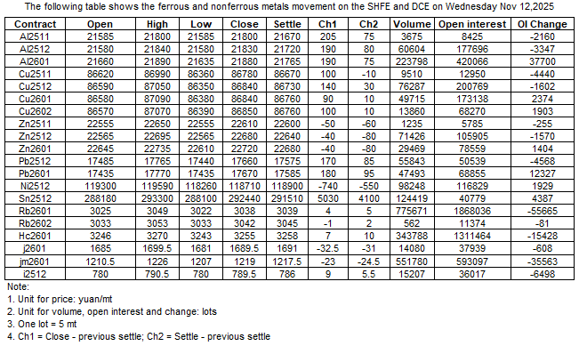 The following table shows the ferrous and nonferrous metals movement on the SHFE and DCE on 12 Nov , 2025