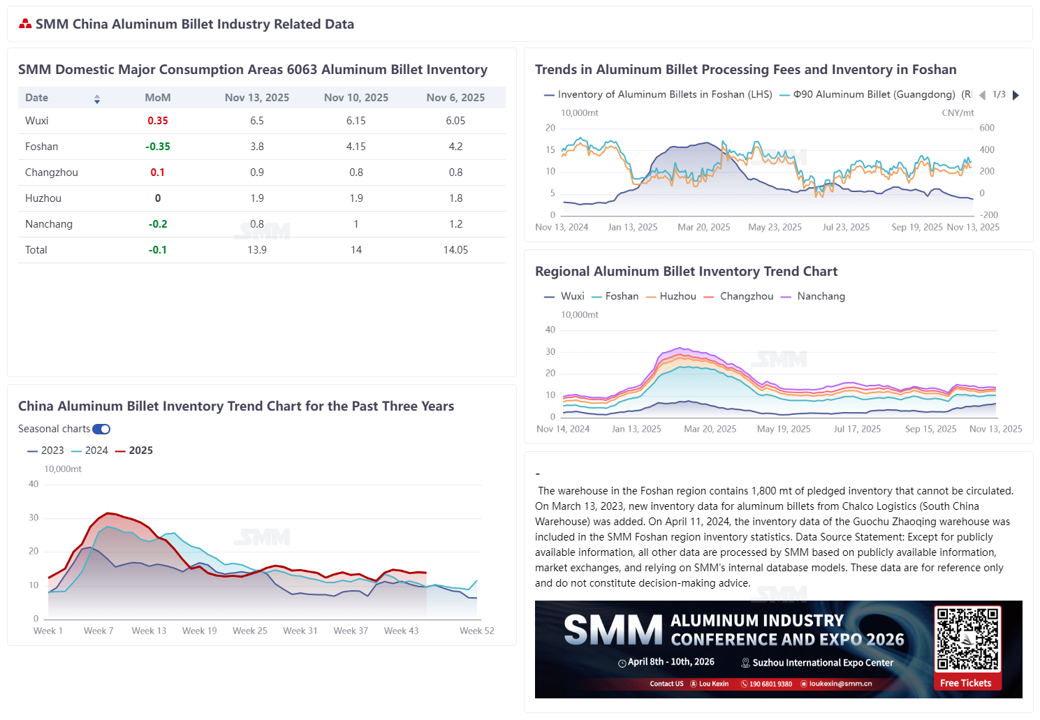 According to SMM statistics, the inventory of aluminum billets in major domestic consumption areas stood at 139,000 mt on November 13, down 1,000 mt from Monday's inventory and 1,500 mt WoW.