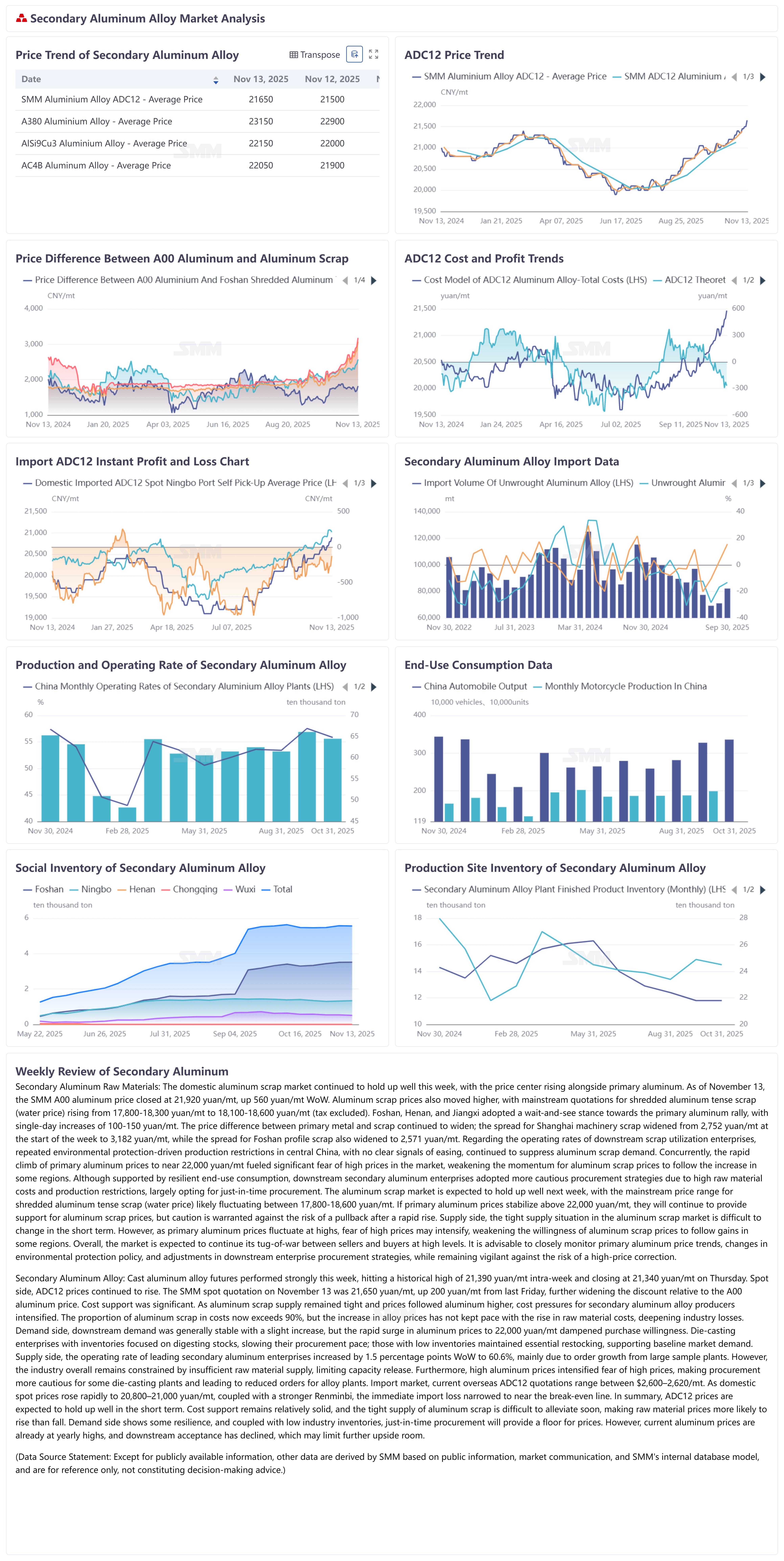 Domestic aluminum scrap market continued to hold up well this week, with the price center rising alongside primary aluminum. As of November 13, the SMM A00 aluminum price closed at 21,920 yuan/mt, up 560 yuan/mt WoW. Aluminum scrap prices also moved higher, with mainstream quotations for shredded aluminum tense scrap (water price) rising from 17,800-18,300 yuan/mt to 18,100-18,600 yuan/mt (tax-exclusive). Buyers in Foshan, Henan, and Jiangxi adopted a wait-and-see stance towards the primary aluminum rally, with daily increases of 100-150 yuan/mt. The price difference between primary metal and scrap continued to widen. The price difference between A00 aluminum and machine-cut aluminum tense scrap in Shanghai widened from 2,752 yuan/mt at the start of the week to 3,182 yuan/mt, while the price difference for aluminum profiles in Foshan also widened to 2,571 yuan/mt. On the operating side of downstream scrap utilization enterprises, repeated environmental protection-driven production restrictions in central China, with no clear signals of easing, continued to suppress aluminum scrap demand. Meanwhile, the rapid climb of primary aluminum prices to around 22,000 yuan/mt fueled significant fear of high prices in the market, weakening the momentum for scrap prices to follow the rise in some regions. Although supported by resilient end-use consumption, downstream secondary aluminum enterprises became more cautious in procurement due to high raw material costs and environmental restrictions, mostly adopting a "just-in-time procurement" strategy. The aluminum scrap market is expected to hover at highs next week, with mainstream prices for shredded aluminum tense scrap (water price) likely fluctuating within the 17,800-18,600 yuan/mt range. If primary aluminum prices stabilize above 22,000 yuan/mt, they will continue to support scrap prices, but caution is warranted against a potential retreat after a rapid rise. Supply side, the tight supply situation in the scrap market is unlikely to change significantly in the short term. However, as primary aluminum prices fluctuate at highs, fear of high prices may intensify, weakening the willingness for scrap prices to follow the rise in some regions. Overall, the market is expected to continue its tug-of-war between sellers and buyers at high levels. It is advisable to closely monitor primary aluminum price trends, changes in environmental protection policies, and adjustments in downstream procurement strategies, while remaining vigilant against high-price pullback risks.