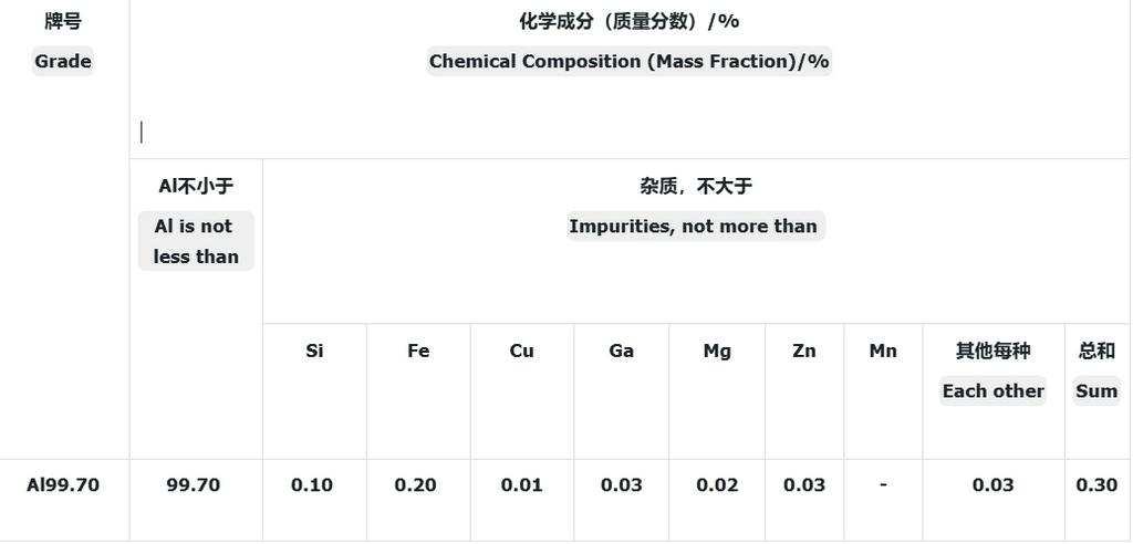 A00 Aluminum Ingot: Complies with the requirements for the "Al99.70" grade in GB/T 1196-2023 Aluminum Ingots for Remelting.