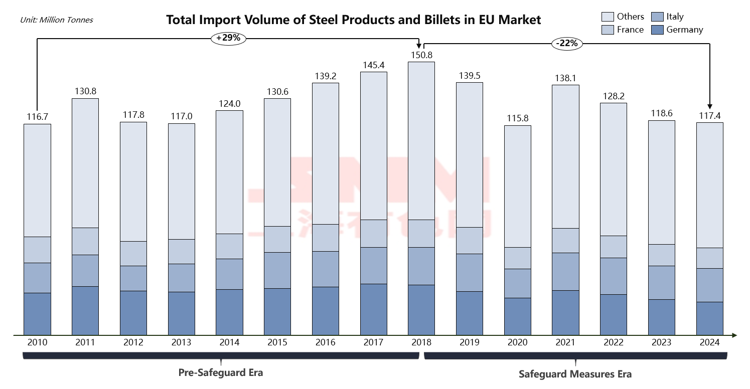 During the Pre-Safeguard Era (2010-2018), EU steel imports steadily increased from 117 million tons to a historical peak of 151 million tons. This sustained growth trajectory highlights the limitations of the EU’s traditional trade defense tools in addressing global steel overcapacity.