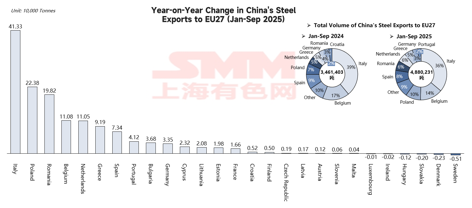 The data reveals a contradictory and warning picture. On the surface, China's steel exports to the EU from January to September 2025 show remarkable vitality, with significant year-on-year growth to multiple countries: