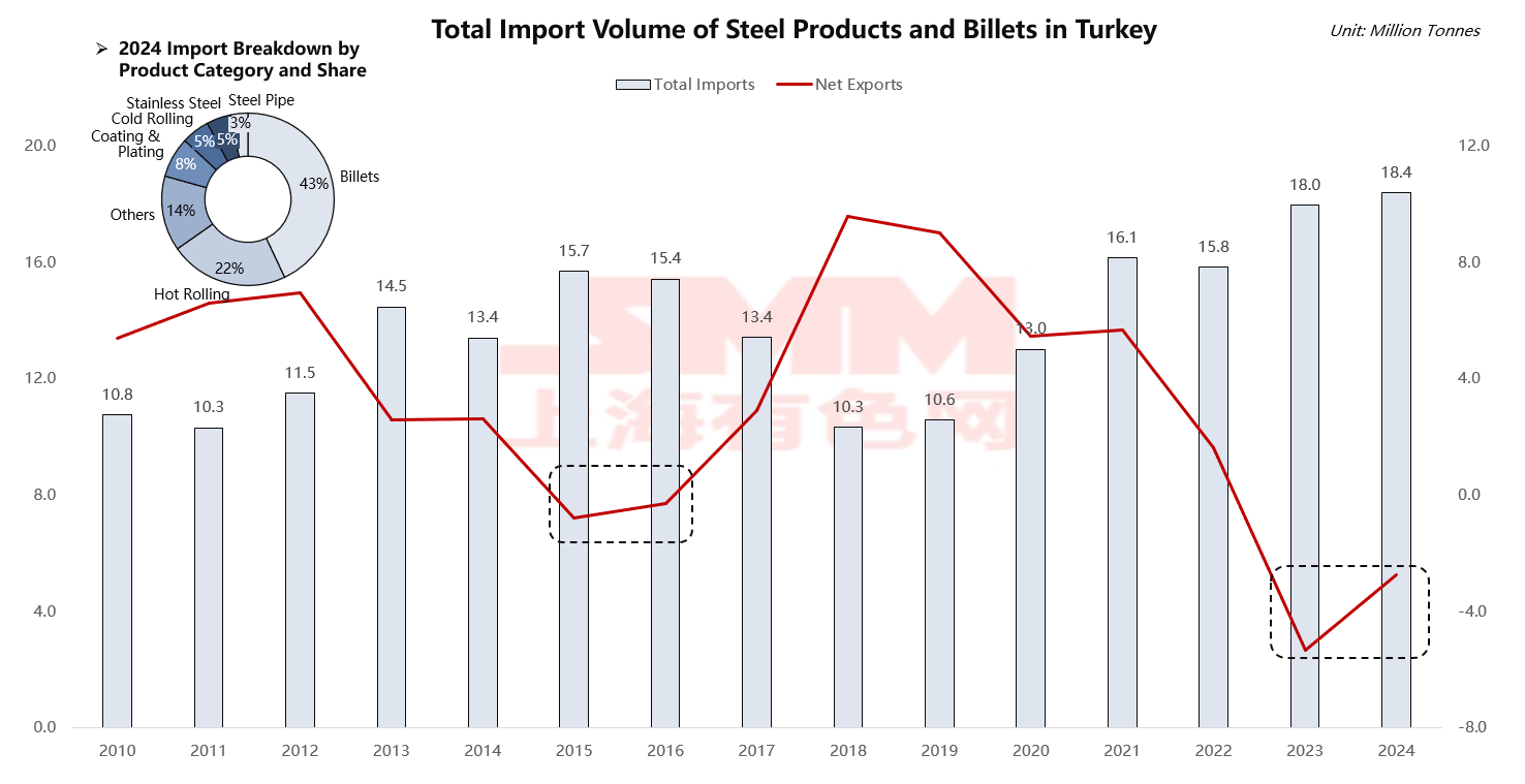 The most unique aspect of this system lies in Turkey's role as a strategic processing hub. Chart shows that its net exports turned negative in 2015-2016 and 2023-2024, precisely evidencing the success of its business model of importing semi-finished products, processing them, and exporting finished products. In-depth analysis reveals that 43% of Turkey's 2024 imports were billets, coupled with 22% hot-rolled sheets, meaning two-thirds of its imports are primary products for further processing. In contrast, its exports are dominated by construction-grade finished products like rebar (26%), steel pipes (14%), and sections (12%). Turkey imports semi-finished products from cost-competitive regions such as China, Russia, and Malaysia, leveraging its relatively low energy and manufacturing costs for rolling or processing, and then exports to the EU, Middle East, and North Africa. When domestic production or export demand is strong, the volume of semi-finished product imports significantly exceeds the volume of primary products directly exported, resulting in negative net exports.