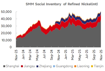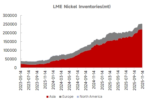 3. Inventory accumulation is the core pressure source for this downturn. As of November 17, LME nickel inventory reached 252,000 mt, and SMM refined nickel social inventory was as high as 53,000 mt, with global refined nickel inventory exceeding 300,000 mt, reaching a five-year high.