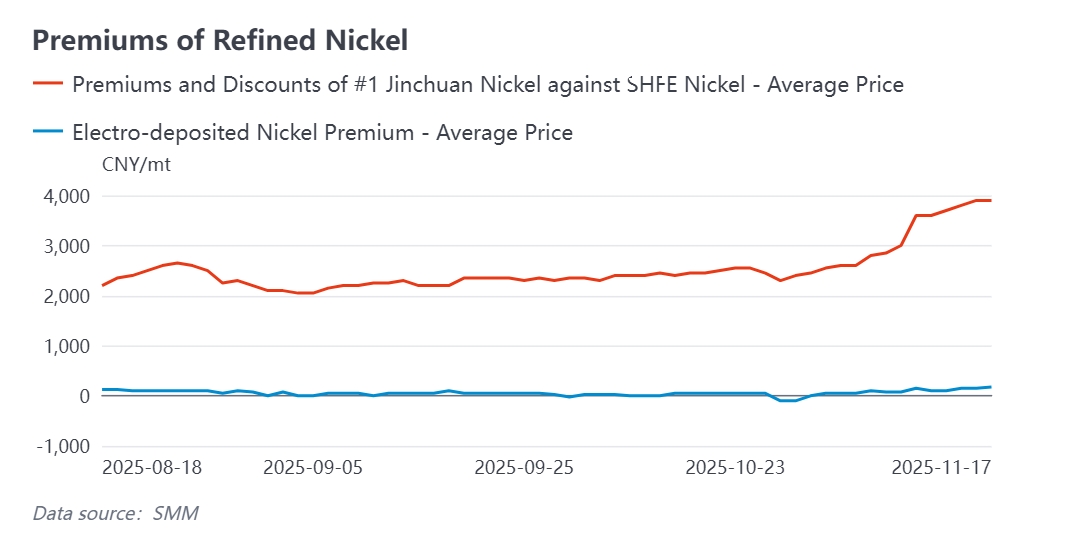 2. In terms of refined nickel supply and demand, due to some enterprises switching to nickel sulphate production, there are significant expectations for reduced refined nickel production in November. Producers and traders currently have a strong desire to hold prices firm, and the premium for refined nickel has strengthened notably since November. The premium for Jinchuan #1 refined nickel reached up to 4,000 yuan/mt, and the premium for mainstream domestic electrodeposited nickel also increased slightly. Alloy and special steel, as well as electroplating enterprises, shifted from an active purchasing attitude when nickel prices first fell to a wait-and-see approach after continuous price declines, waiting for a clear bottom before restocking as needed.