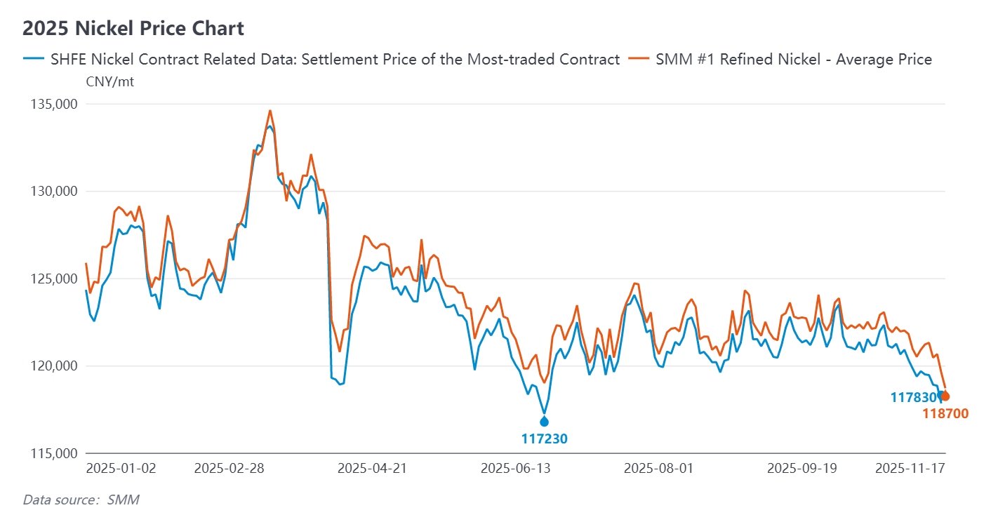 Since October 28, nickel prices have shifted from their previous volatile pattern into a unilateral downtrend, successively breaking through multiple key support levels, with market sentiment turning pessimistic. Specifically, the most-traded SHFE nickel contract fell from 121,000 yuan/mt to 116,730 yuan/mt on November 17, breaching the low seen in June. During the same period, LME nickel prices also dropped from $15,335/mt to below $14,800/mt, hitting a new low for the period. This round of decline marks nickel prices officially breaking below the 118,000–123,000 yuan/mt range that had persisted for nearly four months, with the technical chart showing a clear bearish alignment and the market's center further shifting downward.