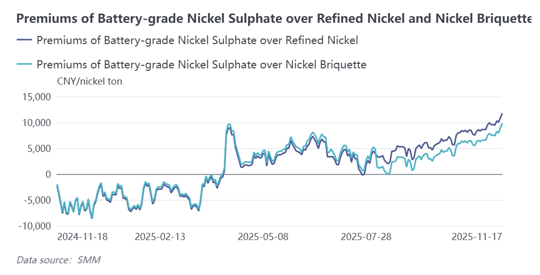 Looking ahead to December: on the raw material side, intermediate product supply is expected to remain tight, and the payables may not ease. Demand side, demand from some leading producers is expected to remain high, but overall downstream demand is unlikely to grow further compared to November, with nickel salt procurement demand expected to decline slightly. Supply side, some producers may have expectations for production cuts by year-end, but attention should also be paid to whether the trend of refined nickel conversion to nickel sulphate can persist. Overall, nickel salt prices are expected to remain under pressure in December.