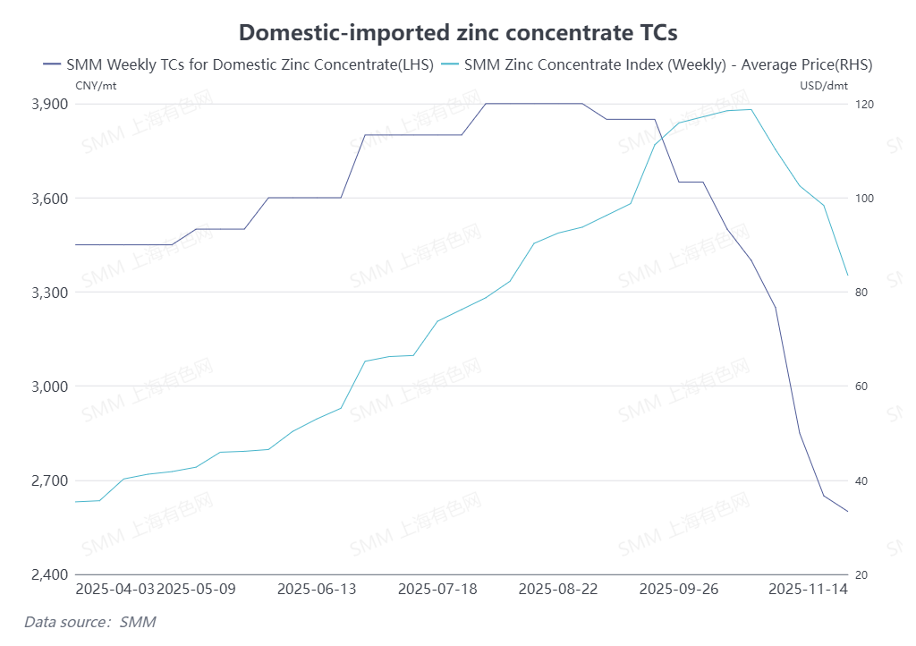 Overseas zinc concentrate production continued to increase in Q3, and China's zinc concentrate imports remained high this year. However, entering Q4, as domestic smelters enter the winter stockpiling phase, domestic zinc concentrate supply has become periodically tight, and both domestic and imported zinc concentrate TCs have shifted to a downward trend. Looking ahead, zinc mine capacity at projects like Gamsberg, Ozernoye, and Kipushi is expected to continue increasing next year, the Romina zinc mine is scheduled to commence production in 2026, the Endeavor zinc mine's output is expected to continue recovering in 2026, and domestically, mines like Huoshaoyun will continue ramping up. Overall, SMM expects global zinc concentrate production to increase by over 400,000 mt in metal content YoY in 2026. However, considering that smelter production both domestically and overseas is also expected to grow significantly next year, the global zinc concentrate supply-demand balance is projected to tighten slightly in 2026 compared to 2025, with China's zinc concentrate market expected to be in a deficit. Under this scenario, there is a risk of the center of domestic zinc concentrate TCs declining next year.