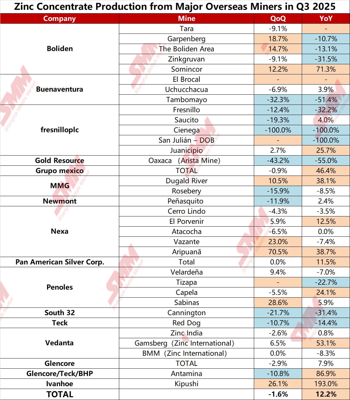 Entering November, overseas miners have successively released their Q3 reports. In terms of production, the Tizapa mine resumed production in Q3, and the Kipushi mine continued to ramp up, leading to a sequential increase in zinc concentrate output. However, production disruptions such as power outages, earthquakes, and declining raw ore grades persisted, while significant reductions were also observed at mines like Antamina and Red Dog. What are the specific details?