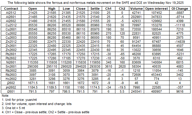 The following table shows the ferrous and nonferrous metals movement on the SHFE and DCE on 19 Nov , 2025