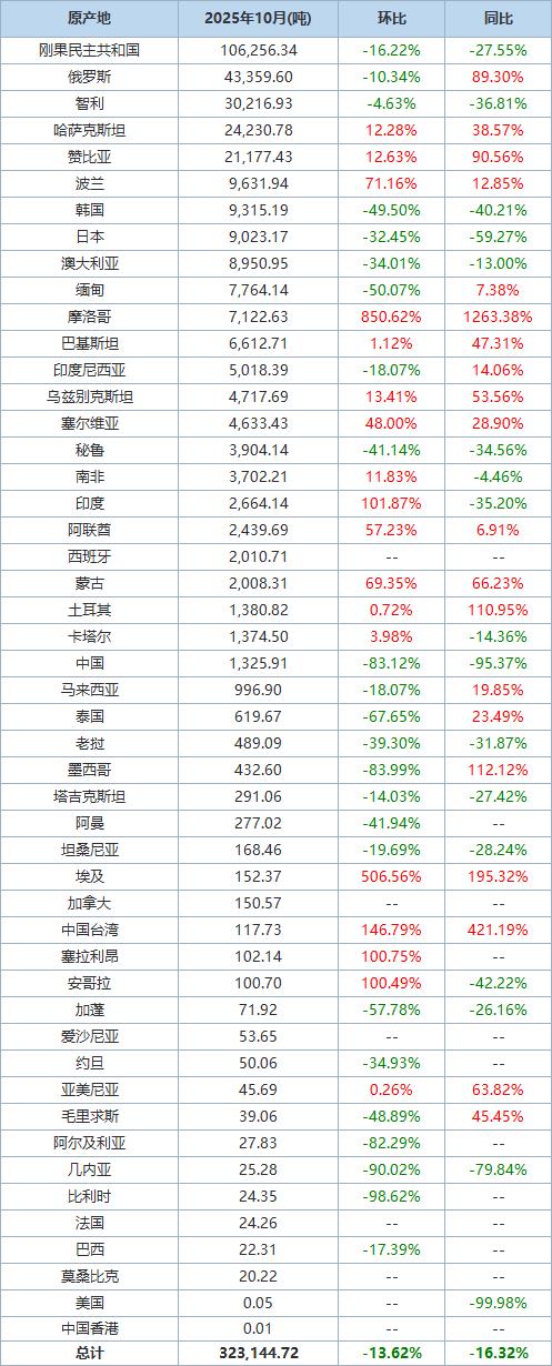 The following is a breakdown of China's copper cathode imports in October 2025, compiled from data on the General Administration of Customs website: