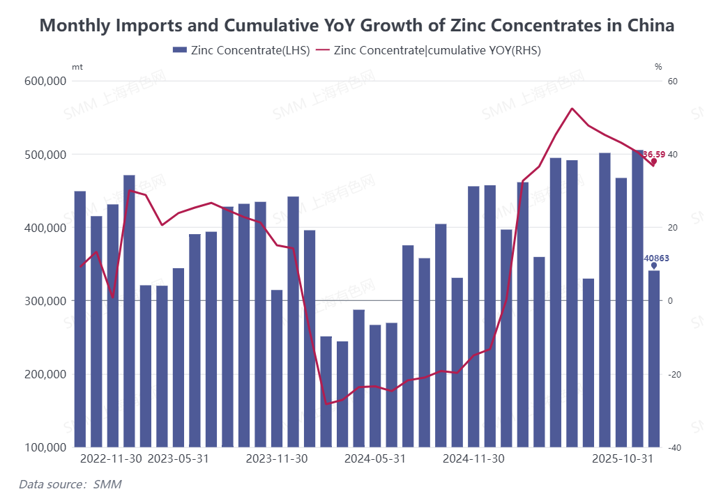 According to the latest customs data, China imported 340,900 mt in physical content of zinc concentrates in October 2025, down 32.56% MoM (a decrease of 164,500 mt in physical content) from September but up 2.97% YoY. Cumulative zinc concentrate imports from January to October totaled 4.3489 million mt in physical content, up 36.59% YoY.