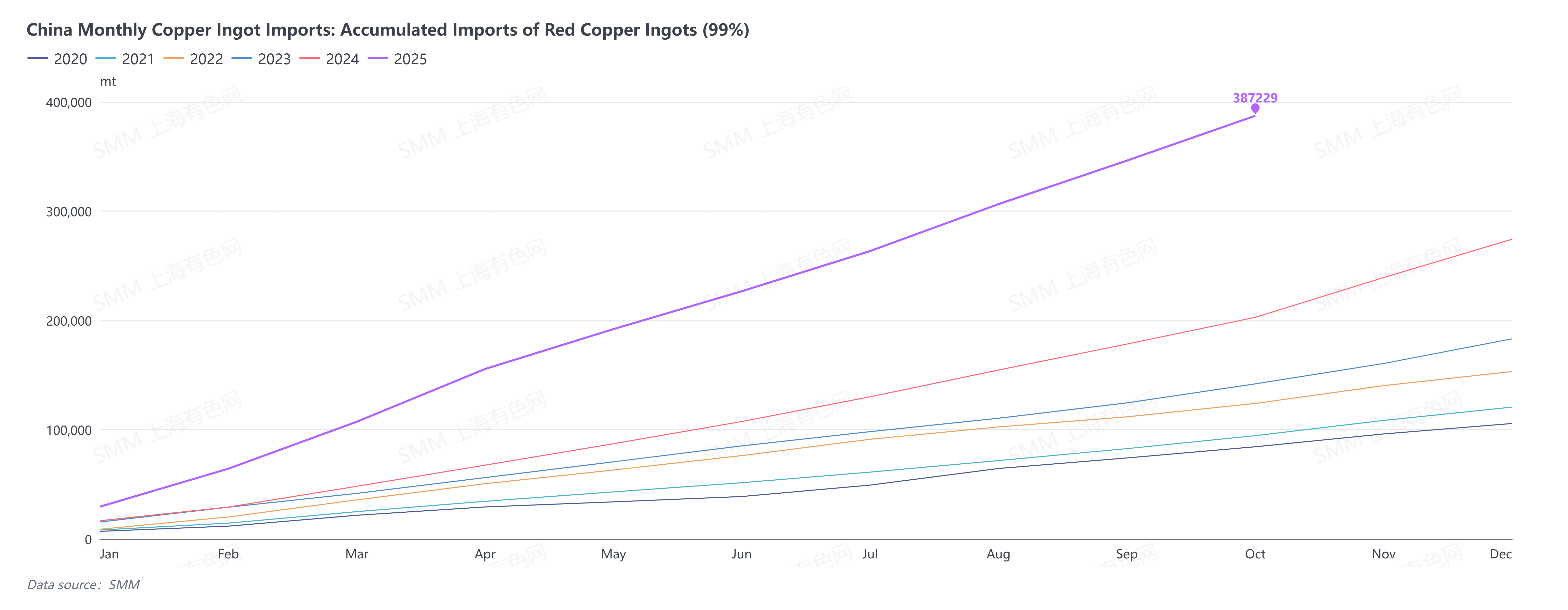 China's copper anode imports rebounded MoM in October, with the increase mainly coming from Zambia, as a major copper anode supplier resumed production after completing maintenance. However, unfavorable import price ratios (SHFE/LME), along with unstable logistics and power supply in Africa, kept China's copper anode imports at low levels compared to the same period in previous years. In addition, the brief closure of Dar es Salaam port due to unrest in Tanzania at the end of October may cause some delays in shipments arriving in Q4. Coupled with expanding overseas demand for copper anode and delayed commissioning times for new projects in Africa, China's full-year 2025 copper anode imports are expected to hit a five-year low.