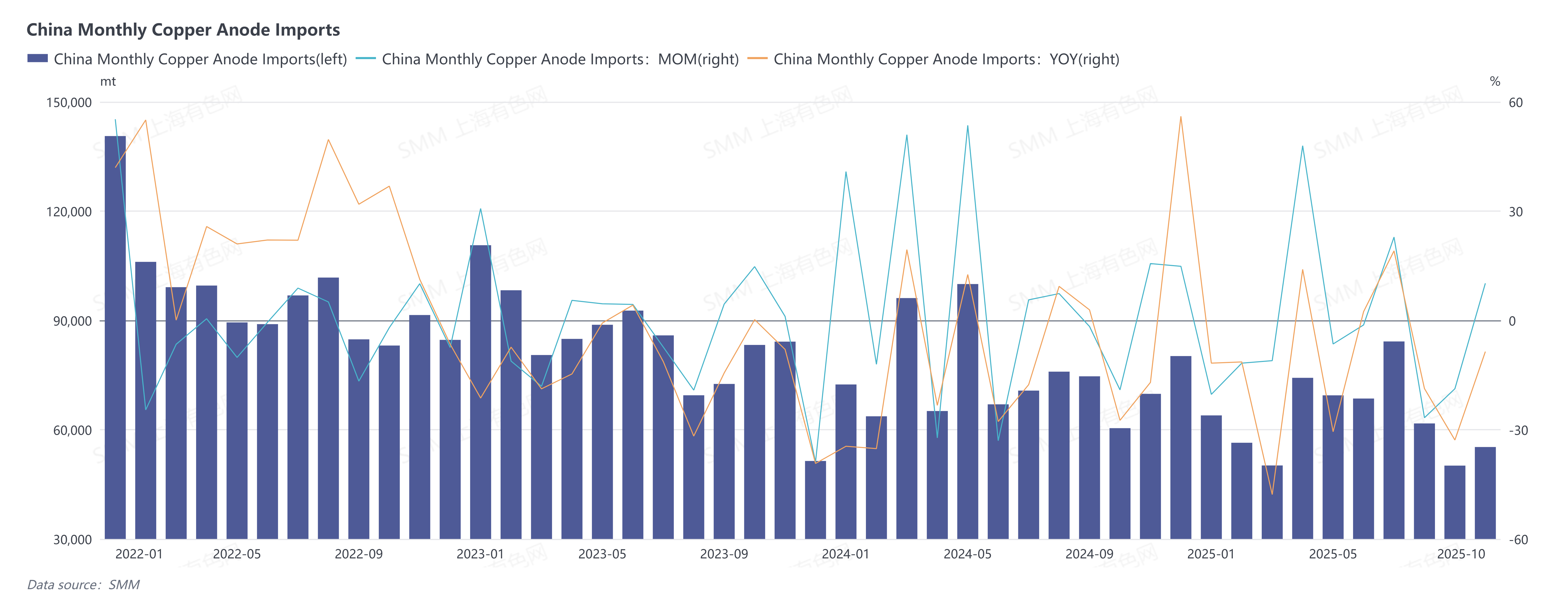 According to General Administration of Customs data, China imported 55,200 mt of copper anode (HS code: 74020000) in October 2025, up 10.18% MoM but down 8.57% YoY. Cumulative imports from January to October 2025 totaled 634,000 mt, down 15.01% YoY.